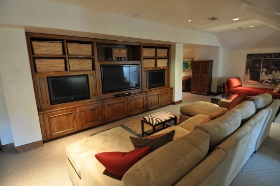 Complementing the always fun and endearing games are dual 58-inch Panasonic Pro plasma TVs and multiple speakers, powered and controlled by a Crestron home automation system. The Lucas’ can use a custom-programmed 13-inch in-wall touch panel, hard button MLX-2 Crestron LCD handheld remote, or iPad control to operate the systems. This multiple control platforms allows flexibility for the family and guests. The system can play multiple sources, including DirecTV, Apple TV, and the high-end Kaleidescape music server simultaneously through each of the displays, so the family can watch the game on TV and engage with the room’s many fun pursuits.